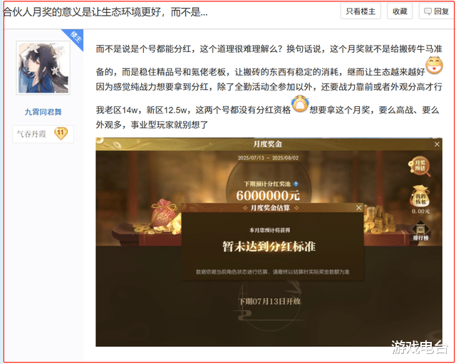 也有一些玩家觉得,现在看到的账号月奖金额,并不一定代表最终结果。毕竟以前没有月奖计划,大家提升角色都是比较纯粹的,主观能动性可能并不太强烈,因此13万战力的角色,也能分到五六百块。可是如果大家都盯着分红想要更进一步,竞争变得激烈,一个月到头能够分的钱到底还有多少,也就不一定了。